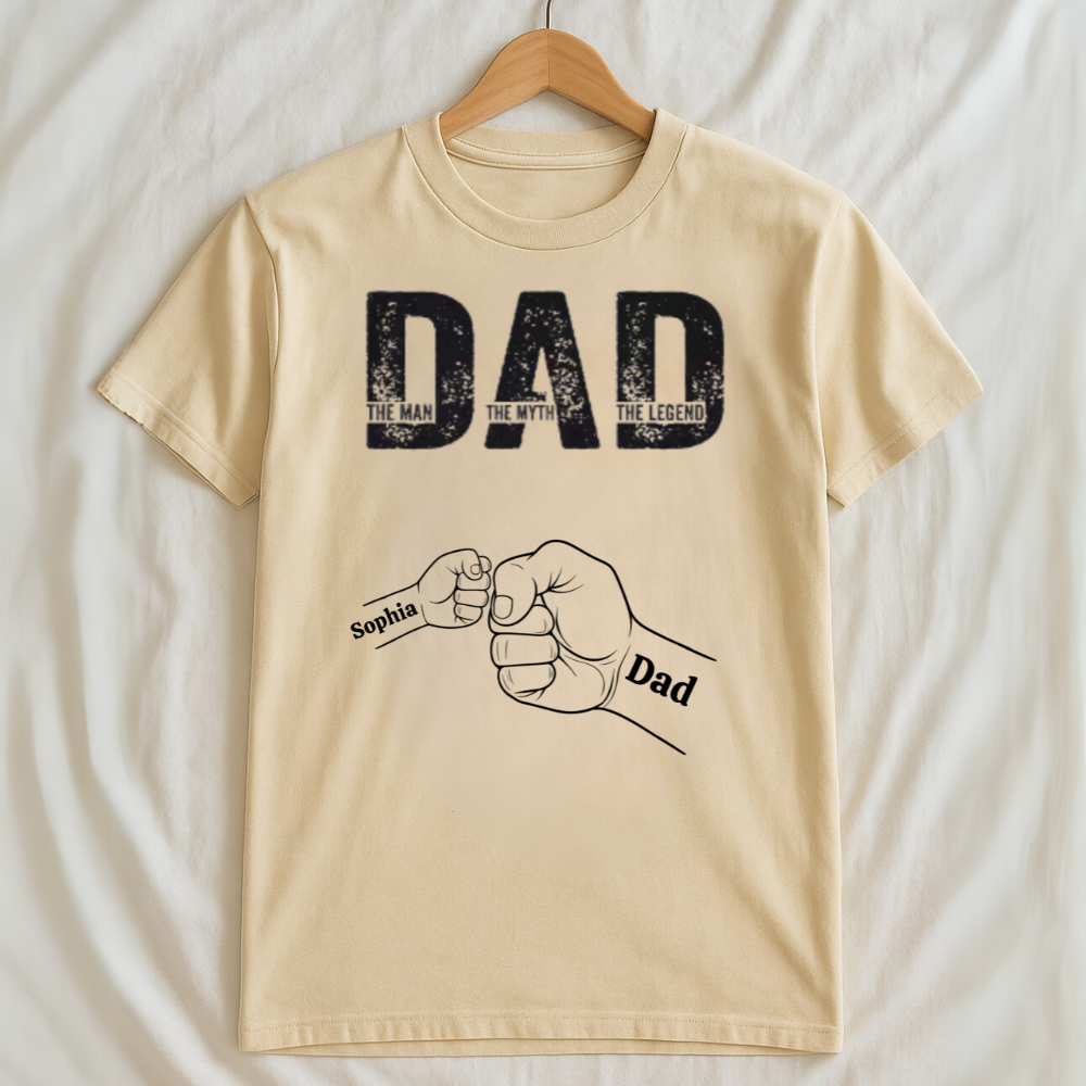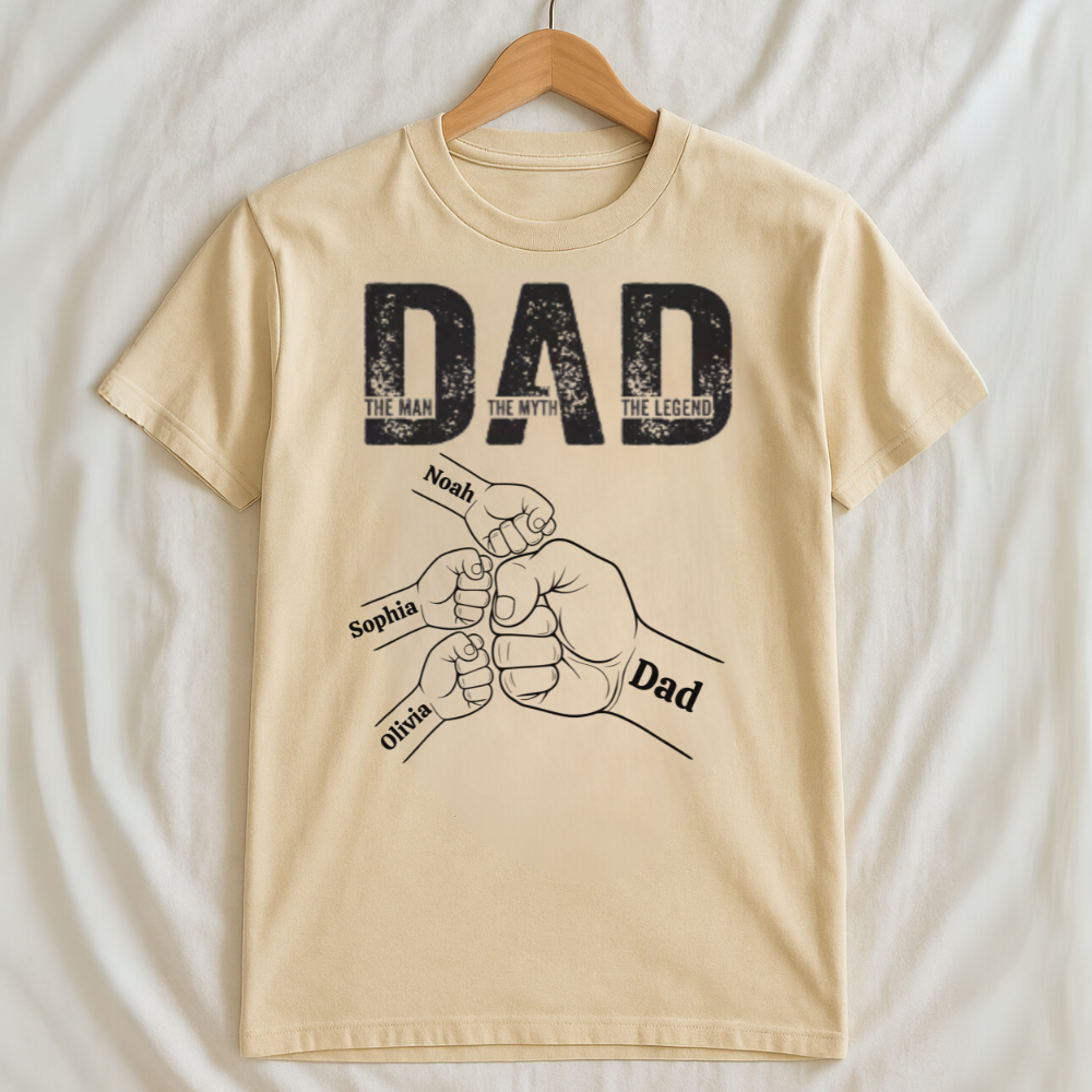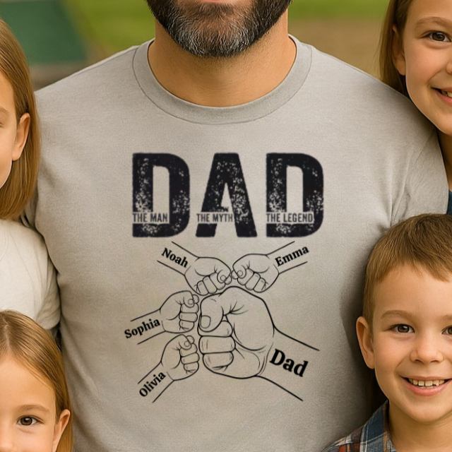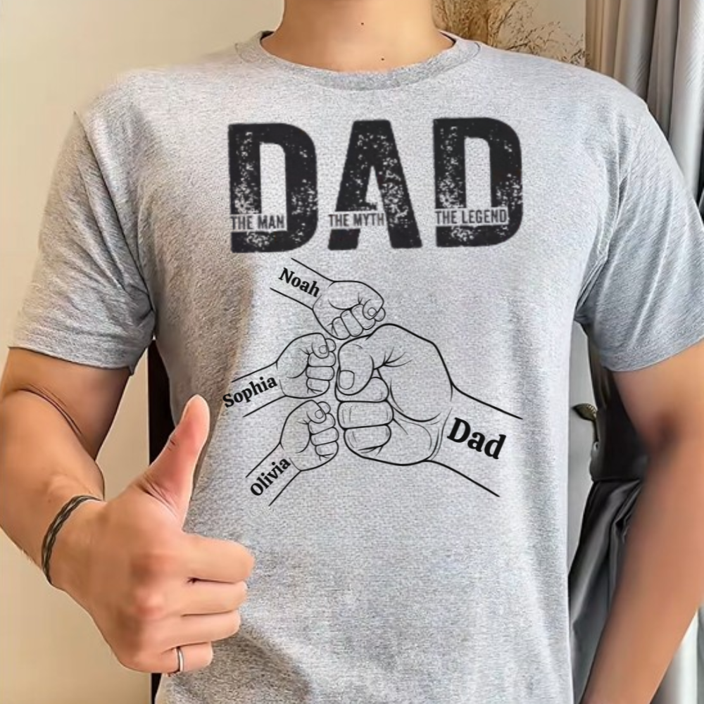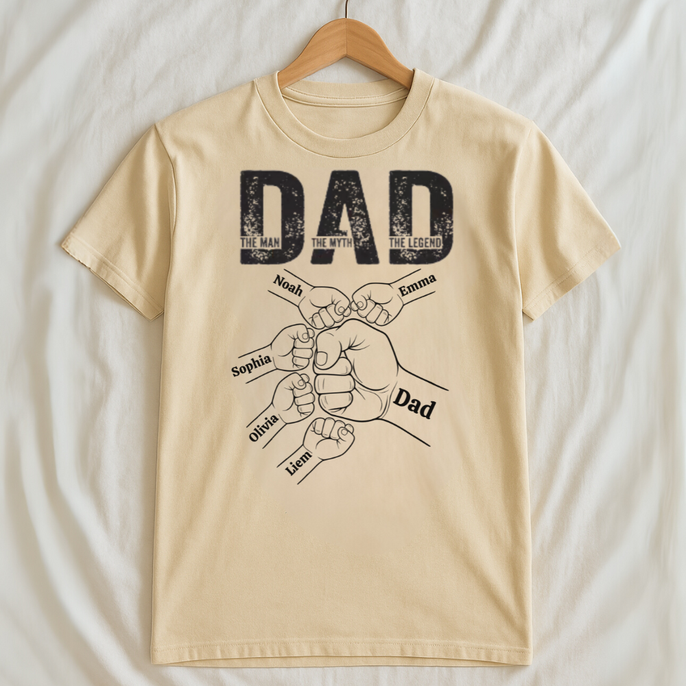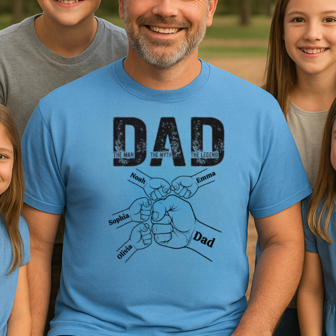 Celebrate Dad's greatness with The Man, The Myth, The Legend Shirt – Custom Fist Bump Design with Kids’ Names. Featuring a bold "DAD" design and personalized fists of up to 6 kids, this shirt is a heartfelt tribute to the man who holds the family together. Each fist represents a special child’s name, making this more than just a shirt – it’s a symbol of love, legacy, and strength.