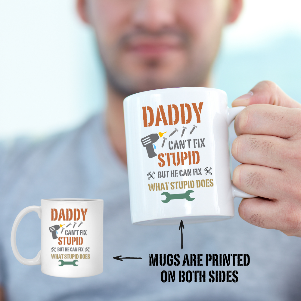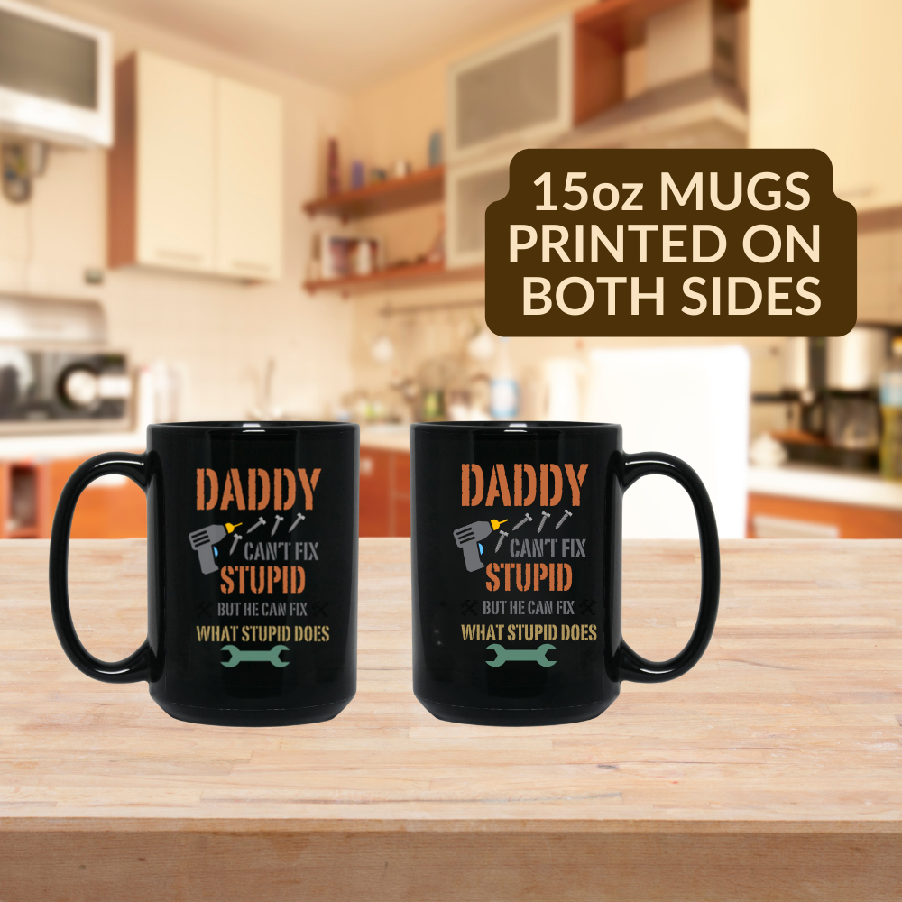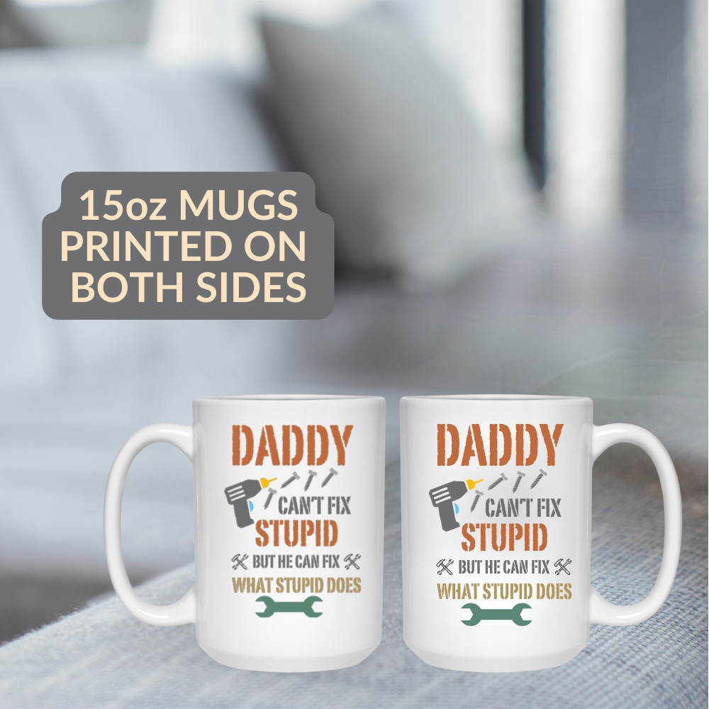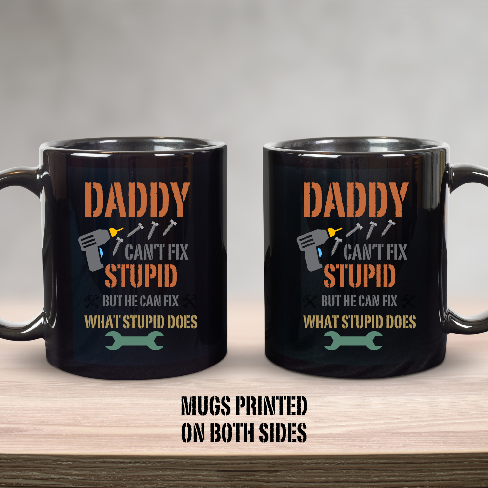 Make Dad's morning routine a little brighter with our "Daddy Fixes What Stupid Does" mug! This hilarious design is printed on both sides of the mug, ensuring it delivers double the laughs.