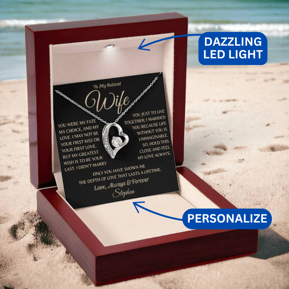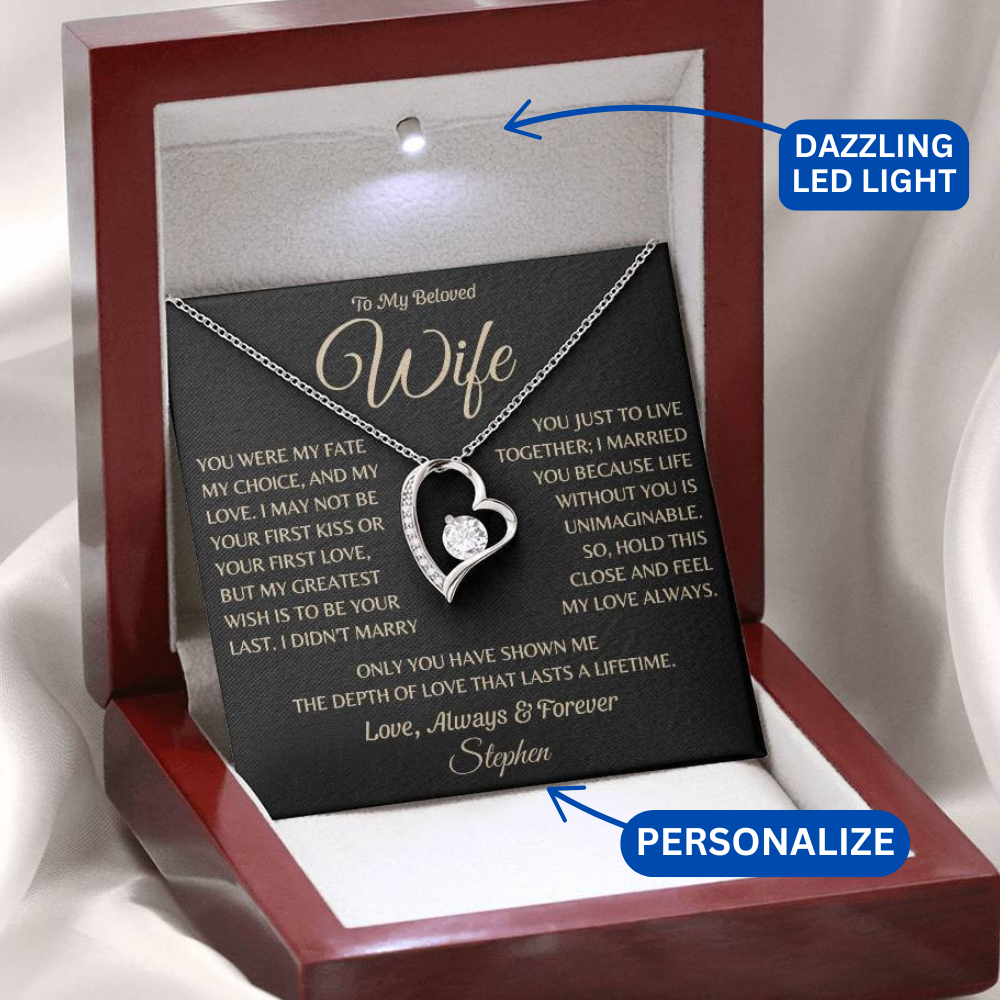 The Always & Forever Love Necklace for Wife is a heartfelt way to show her how deeply she’s cherished. This timeless piece symbolizes the enduring love and unbreakable bond you share, making it perfect for an anniversary, birthday, or simply to remind her of your unwavering devotion. Every glance will remind her of your commitment and how much she means to you, creating a cherished keepsake she’ll hold close for years to come. Your piece is showcased on a choice of seven beautiful, heartfelt message cards and is lovingly packaged in a complimentary soft touch box for easy gifting. Elevate your presentation by upgrading to the mahogany style luxury box, which features a brilliant LED spotlight.