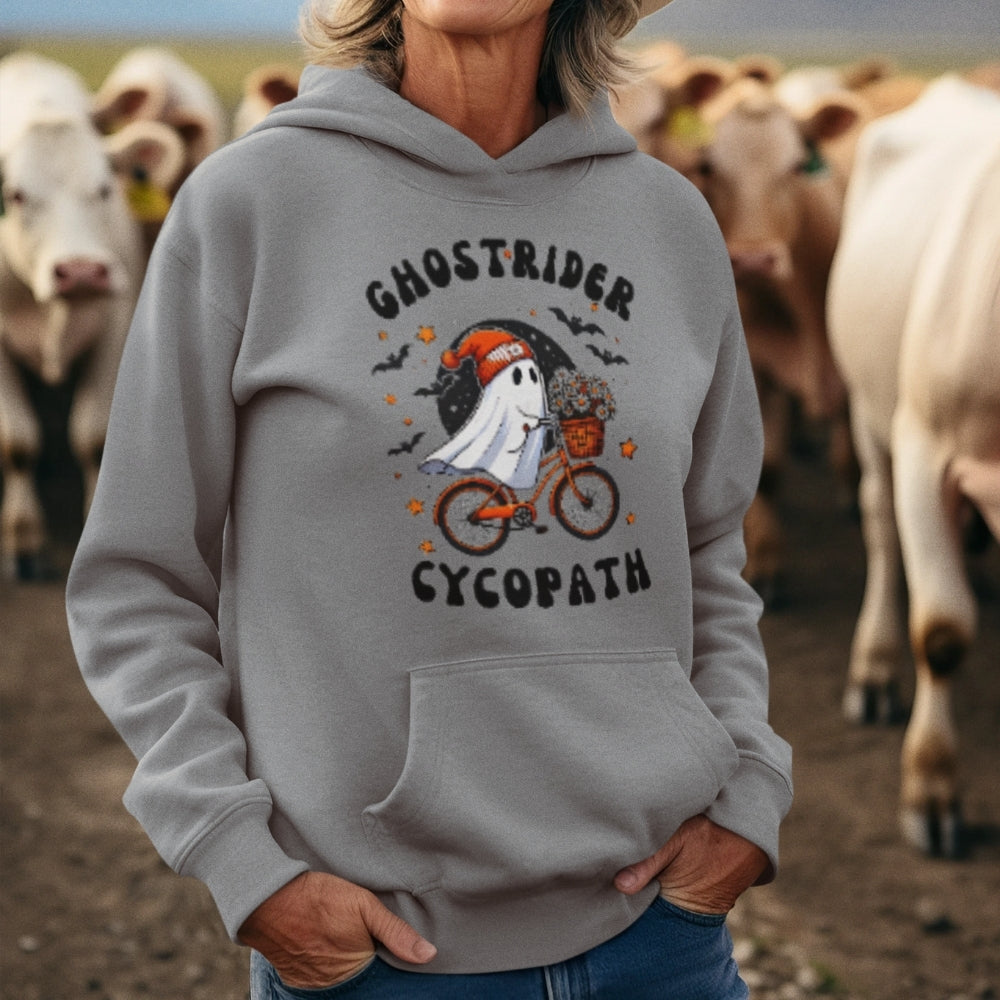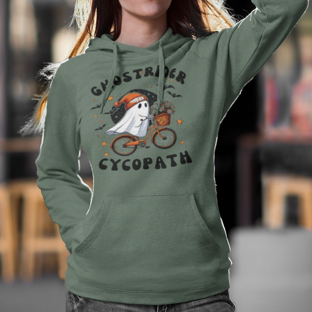 Gear up for the spooky season with our GHOSTRIDER Cycopath Hoodie! This hoodie is designed for warmth and style, featuring a ghost on a bicycle under a moonlit sky, surrounded by bats and stars. Ideal for those chilly nights or brisk morning rides, it’s the perfect blend of comfort and Halloween spirit. Whether you’re a cycling enthusiast or just love a good ghostly design, this hoodie will keep you warm while turning heads.