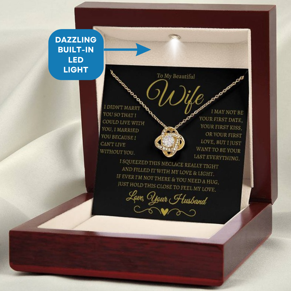 Express your deepest feelings with the I Can't Live Without You" Love Knot Necklace, a heartfelt symbol of your unbreakable bond. Crafted with care, this necklace is not just a piece of jewelry but a message of enduring love. The pendant represents the infinite connection between two souls. As the message card beautifully states, "I wasn't your first love, first kiss, or first date, but I want to be your last everything." Each time your wife wears this necklace, she’ll feel the love you've poured into it.
