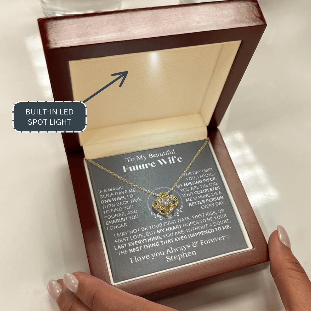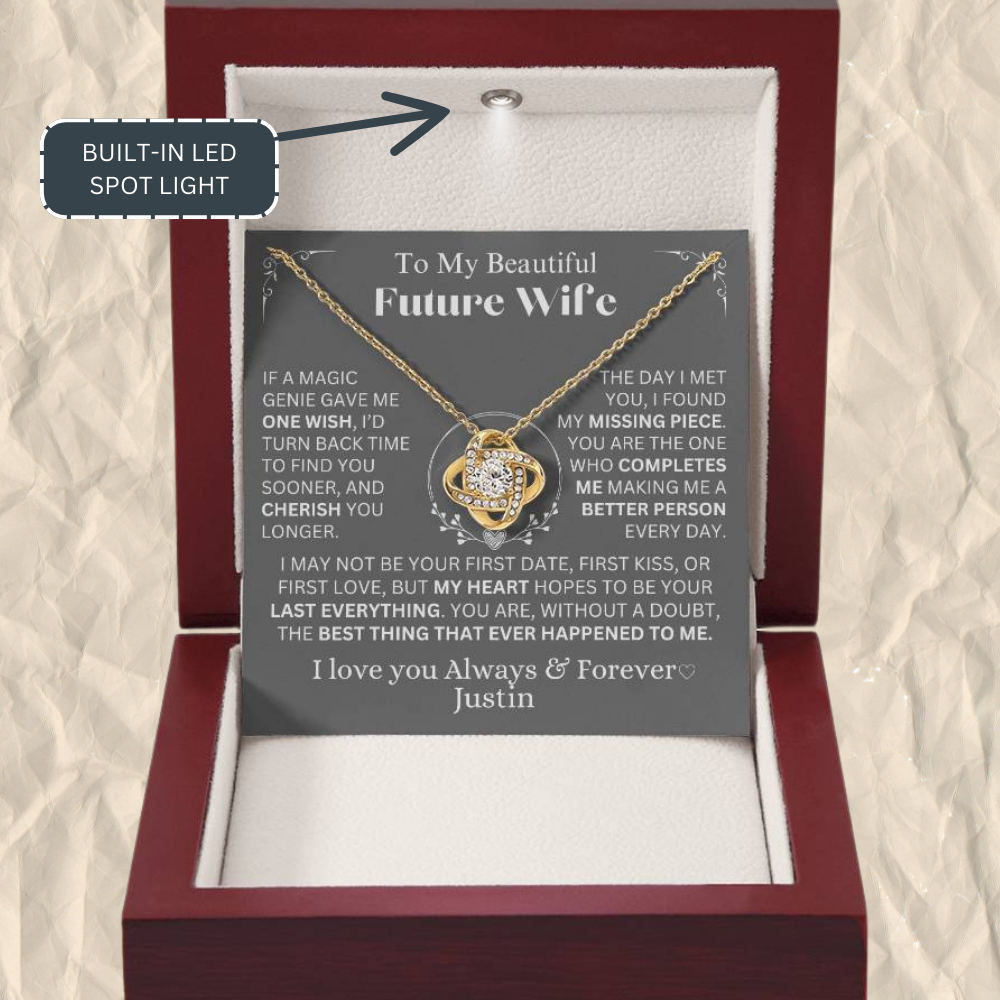 The My Last Everything - Eternal Love Knot Necklace for My Future Wife is more than just a gift—it’s a reflection of unwavering devotion. She is the love that was always meant to be, the missing piece that makes life whole. While she may have had a first love, a first kiss, and a first date, this is a promise to be her last in every way. A timeless symbol of forever love. Your piece is lovingly packaged in a complimentary soft touch box for easy gifting. Elevate your presentation by upgrading to the mahogany style luxury box, which features a brilliant LED spotlight.