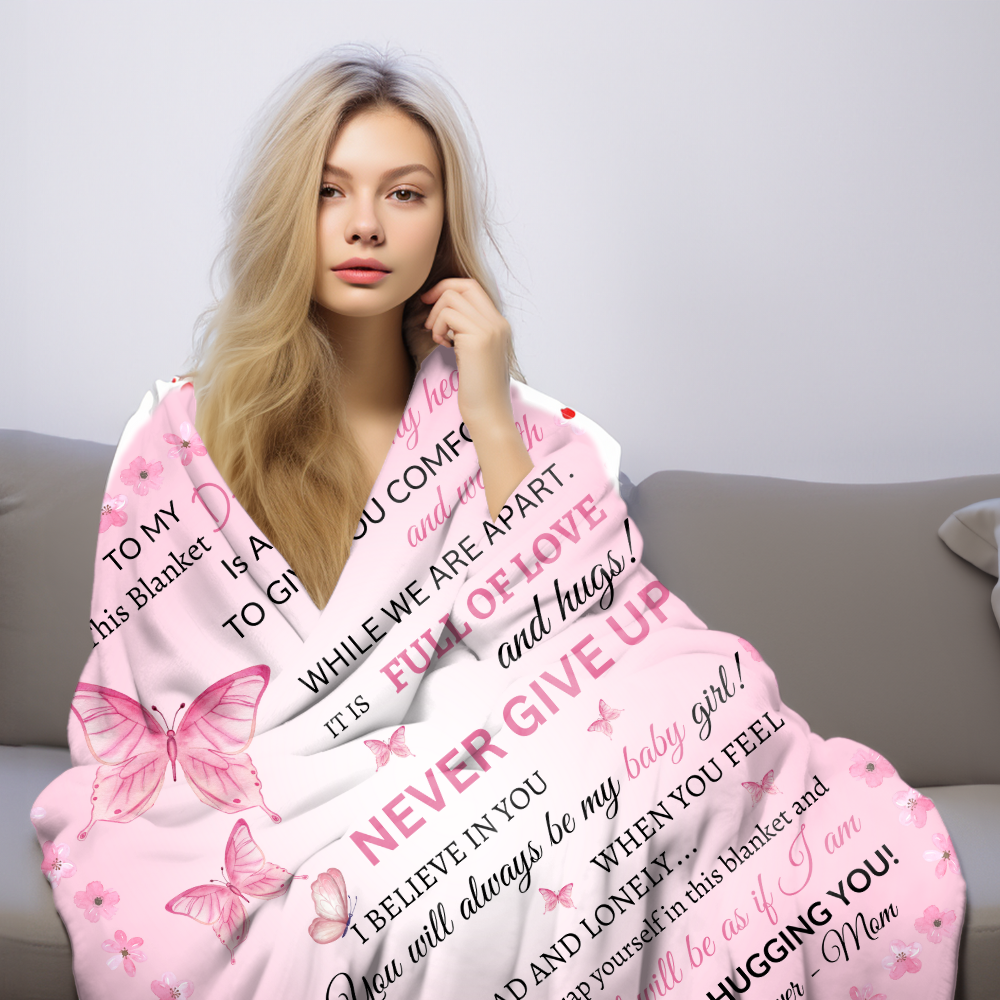 Wrap your daughter in love and warmth with the Mother-Daughter Keepsake Blanket. This heartfelt blanket is a comforting gift from Mom, reminding your daughter that no matter where life takes her, she'll always be your baby girl. When she feels down or lonely, this cozy blanket provides a comforting touch, letting her know you're always by her side. The Mother-Daughter Keepsake Blanket is available in Cozy Plush Fleece or Premium Sherpa, 3 colors (white, pink and lilac) and 3 sizes (baby blanket - 30 x 40", throw - 50 x 60" and queen 60 x 80"). More than just a soft accessory, it's a keepsake that symbolizes the unbreakable bond between a mother and daughter, reminding her she is loved, believed in, and cherished every day.